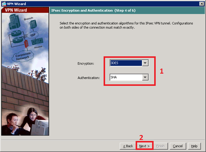 - Ở bước 3 chọn thuật toán mã hóa và authen cho Tunnel lưu ý phải phù hợp với Cisco 2811 site A. Ở đây ta chọn 3DES và SHA do ở bước 5 site A ta chọn esp-3des esp-sha-hmac