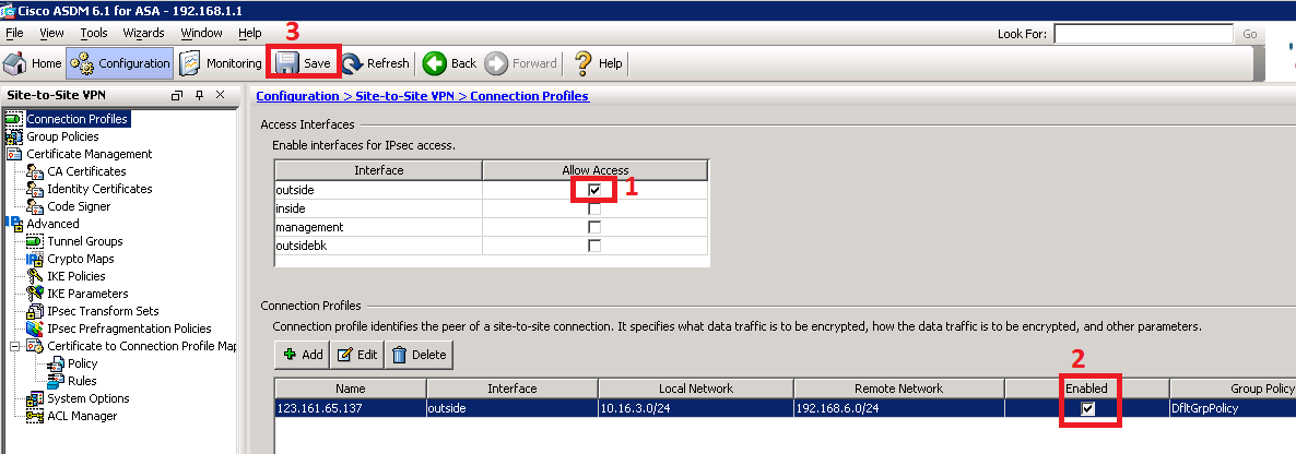 - Tại Access Interface click vào interface outside và click và check box Allow access tương ứng và nhấn Save