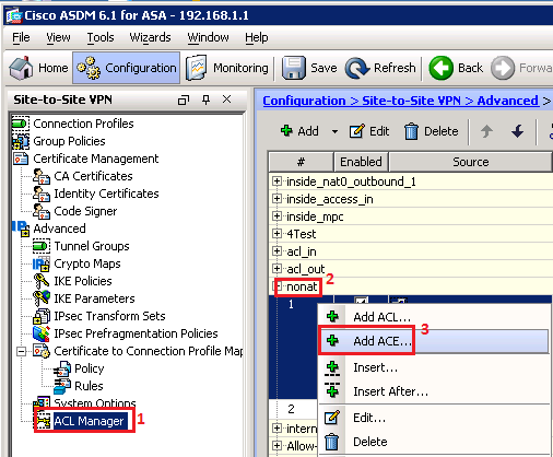 - Sau khi tạo Connection Profile xong ta tiến hành set access-list nonat cho kết nối VPN. Lưu ý mặc định nonat sẽ disable, bạn cần phải enable nó lên trước sau đó mới có thể tiến hành tạo access-list cho nonat.