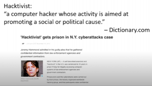 Hacktivis****t: khi hacker đột nhập vào hệ thống của chính phủ hoặc máy tính của công ty như một hành động phản động. Hacktivists sử dụng hack để nâng cao nhận thức của chương trình nghị sự xã hội hay chính trị của họ, cũng như bản thân, ở cả đấu trường trực tuyến và ngoại tuyến. Họ là những người thúc đẩy một chương trình nghị sự chính trị bằng cách hack, đặc biệt là làm xấu hoặc vô hiệu hóa các trang web. Mục tiêu hacktivist thường gặp bao gồm các cơ quan chính phủ, các tập đoàn đa quốc gia, hoặc bất kỳ tổ chức nào khác mà họ cảm nhận như một mối đe dọa. Nó vẫn là một thực tế, tuy nhiên, việc tiếp cận trái phép là một tội ác, không phân biệt mục đích của họ.