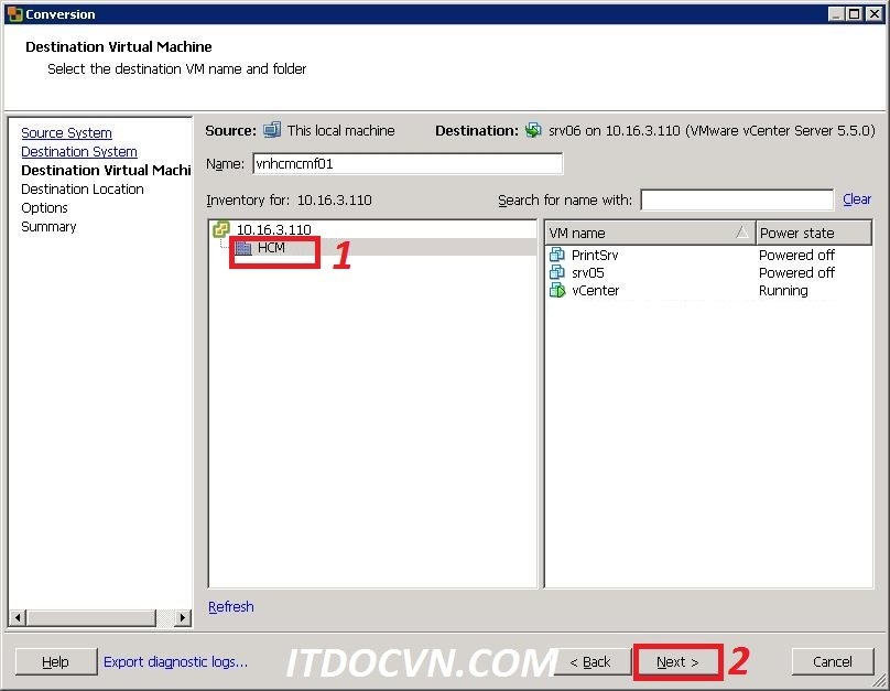 II.Convert máy vật lý lên vCenter: - Ở bước 1,2,3 làm giống như bước 1,2,3 ở phần Convert máy vật lý lên vmware workstation phía trên. Bước 4: