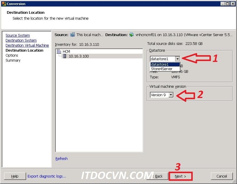 Bước 6: Hộp thoại Destination Location xuất hiện ta chọn Database lưu trữ cho VM, ở đây mình chọn datastore1(SAN) để lưu trữ VM trên SAN. và chọn version VMware. sau đó nhất Next