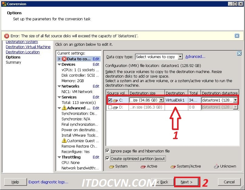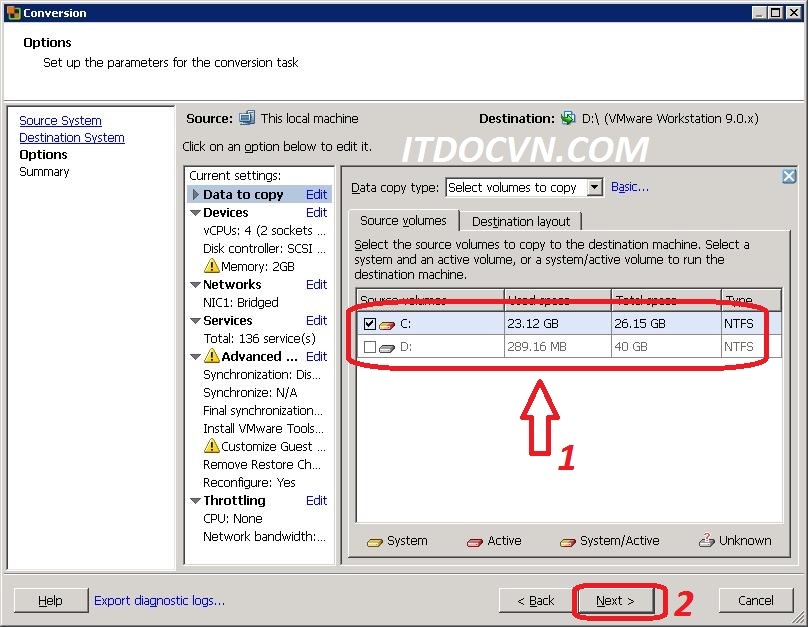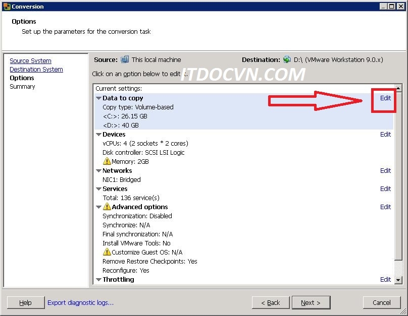 - Tại hộp thoại Options, bạn edit lại 1 số thứ cần thiết như ổ cứng bạn muốn convert lên phân vùng nào? hay bạn muốn set RAM cho dest virtual machine rao bao nhiêu, và CPU dest sẽ chạy bao nhiêu core, điều nầy bạn phải cần chắc chắn rằng dest machine có thể chạy được với cấu hình mà bạn sẽ convert, nếu không sau khi bạn convert xong máy sẽ không khởi động lên được, do không đảm bảo về hardware.