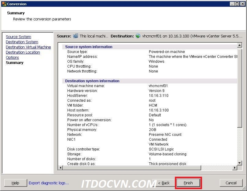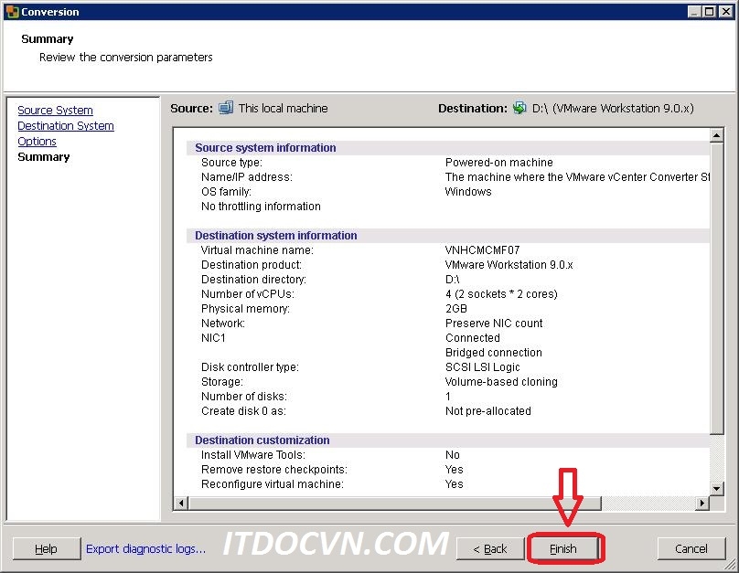 Bước 6: Hộp thoại Sumary sẽ tổng kết lại những lựa chọn của bạn, và bạn nhấn finish để bắt đầu quá trình convert.