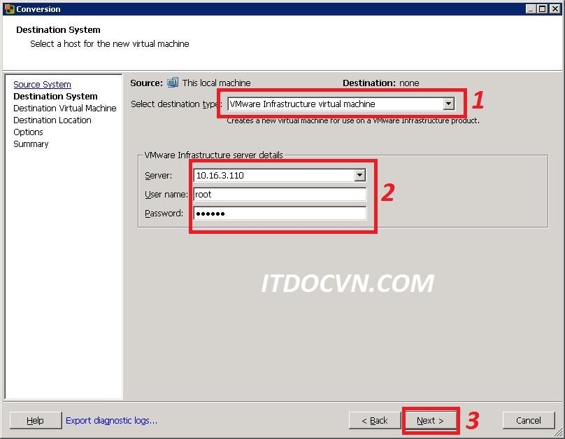 - Select destionation type: chọn VMware Infrastructure virtual machine