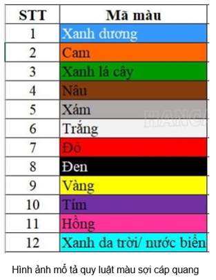 Như đã trình bày ở trên, cáp quang có 2 loại chính là cáp quang Single mode (SM) và cáp quang Multimode (MM), hiện nay cáp quang single mode được sản xuất chủ yếu tại Việt Nam bởi các nhà máy như M3 Viettel, Sacom, Postef…Tất cả cáp quang sản xuất tại Việt Nam đều có sử dụng chung tiêu chuẩn quốc tế của nghành Viễn Thông và đáp ứng các tiêu chuẩn riêng ở Việt Nam. Vậy nên quy luật màu sợi quang nó cũng sẽ theo chuẩn quốc về và nó như bảng quy luật như sau: