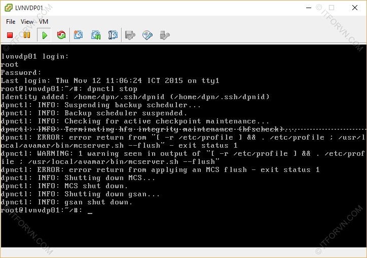 Bước 1(Step 1): Bạn đăng nhập vào bằng tài khoản root tại giao diện console của VDP và stop Service dpnctl