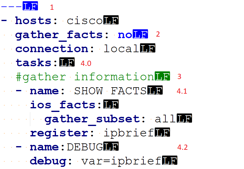 (2) Key ở đây là "gather_facts". Value ở đây là "no"