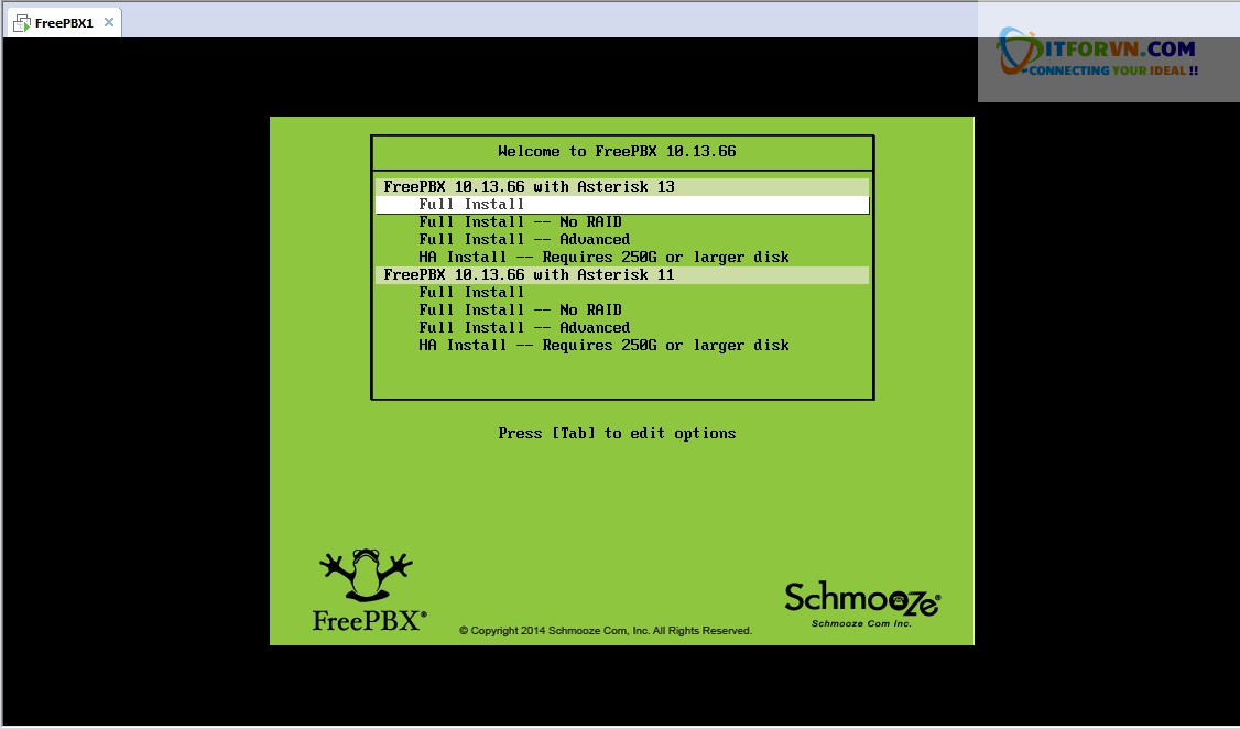 Chon FreePBX 10.13.66 with Asterisk 13.Chọn Full Install sau đó nhấn Enter để chương trình tiếp tục chạy. Chờ chương trình chạy đến bước như hình dưới