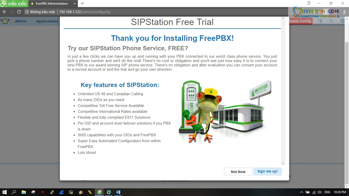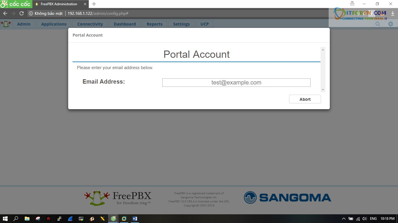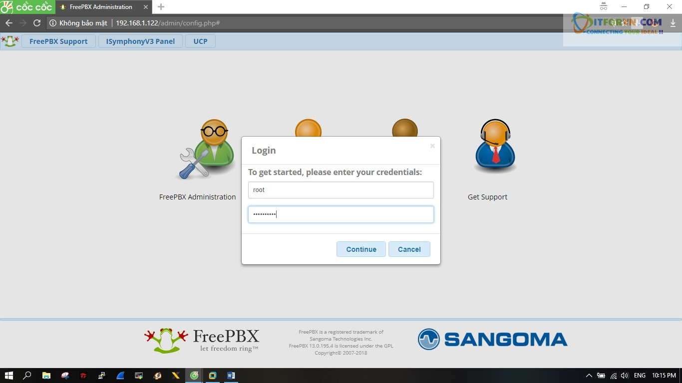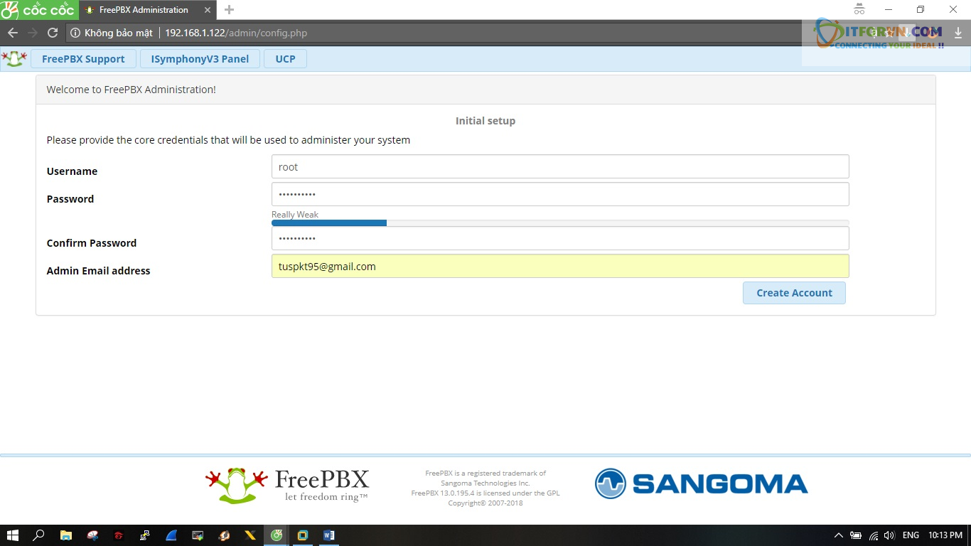 Tiến hành nhập địa chỉ IP này vô trình duyệt web để login vô giao diện web của FreePBX và điền đầy đủ thông tin user, password để tạo 1 tài khoản. Tài khoản này dùng để đăng nhập trên trình duyệt web