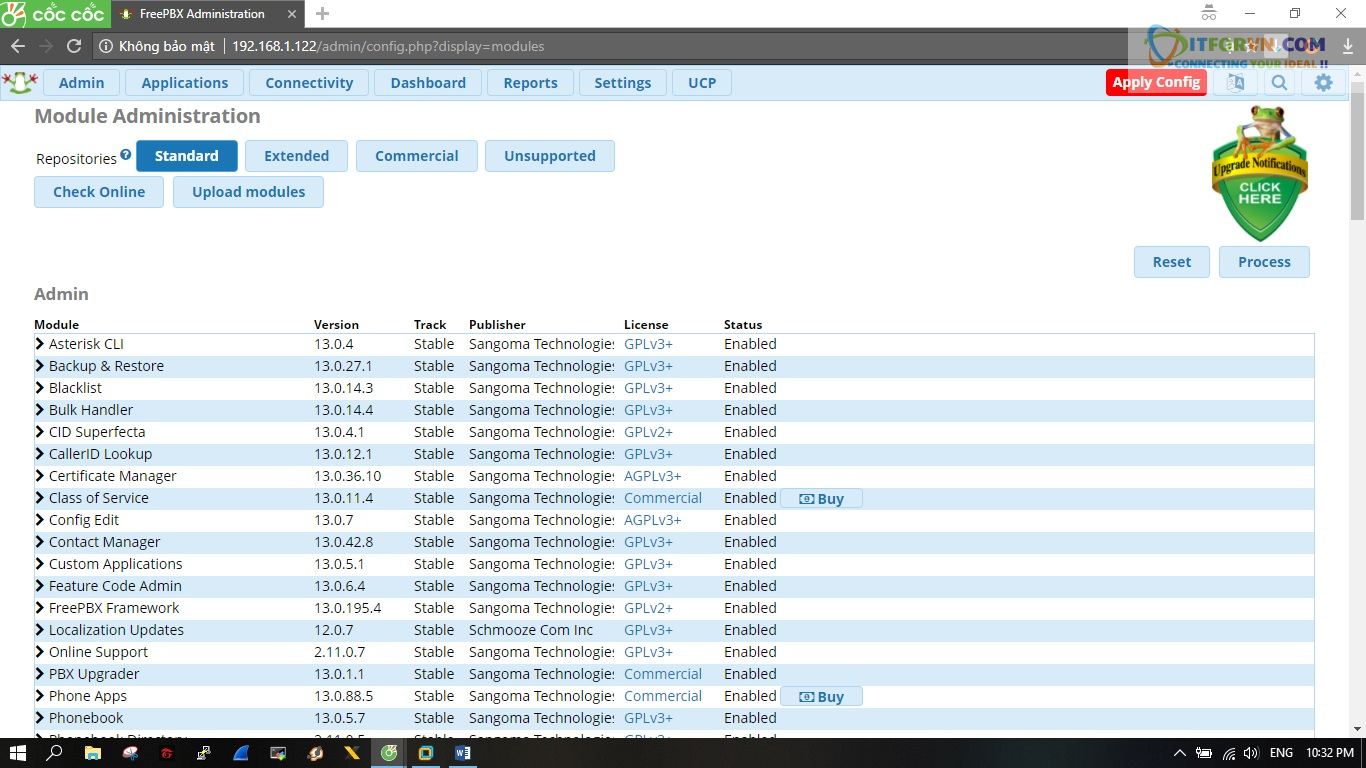 Tiếp tục ta tiến hành update dashboard mới nhất.Chọn Admin -> Module Admin