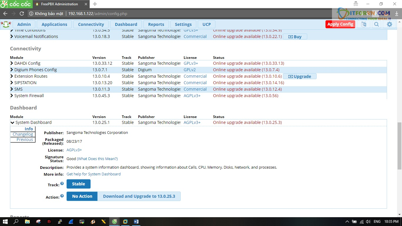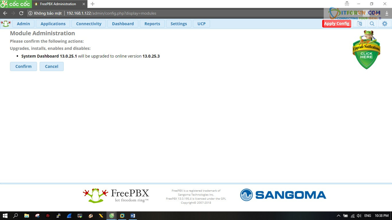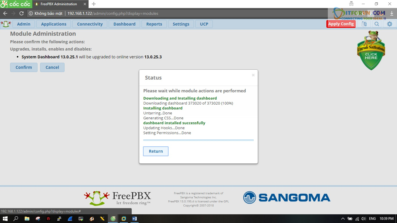 Sau khi update xong chọn Return và chọn Dashboard và nhấn Apply Config là cài đặt thành công