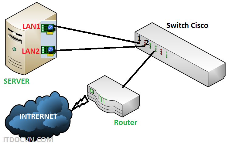 Để demo cho dễ hiểu trong mô hình bài Lab nầy mình sẽ teaming card mạng trên windows server 2012(LAN1, LAN2) và switch cisco được group 2 port(port1,port2) tương ứng và nhóm nầy nằm ở vlan 3.