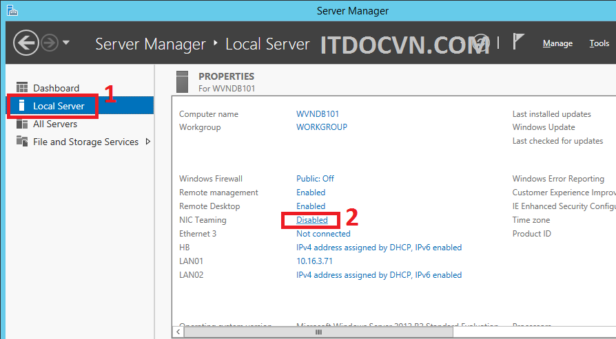 - Chọn Local Server sau đó Ngay Dòng NIC Teaming click chuột vào link Disable.