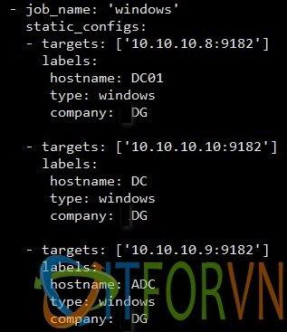 Bước 6: Tạo job trong prometheus để giám sát Windows Server này với nội dung sau: