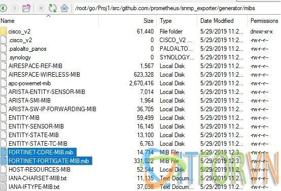 Vì trong thư mục mibs download ở trên không có mibs của Fortigate. Vì thế mình phải download mib của fortigate về và bỏ vào đường dẫn. ${GOPATH-$HOME/go}/src/github.com/prometheus/snmp_exporter/generator/mibs