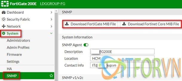 Đối với mibs của Fortigate thì các bạn download như sau: Login vào Fortigate, vào System, vào SNMPvà chọn download mibs về.