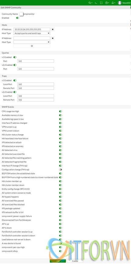 Bước 04: Để prometheus có thể thu thập được metric của Fortigate bạn phải enable snmp trên firewall Fortigate. Chúng ta login vào Fortigate, SNMP, sau đó create snmp v2 (mình ko sử dụng snmp v3) như hình sau:
