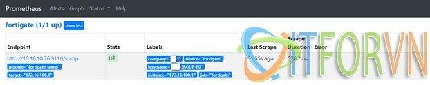 Target: là ip của fortigate Module: chính là module mà bạn tạo bằng generator cho fortigate Nếu thấy có metric là OK. Bước 09: Tạo job trong prometheus để giám sát Fortigate với nội dung job sau: