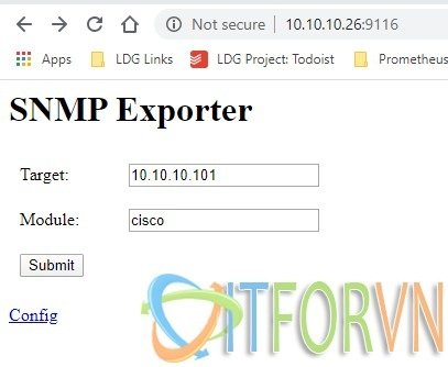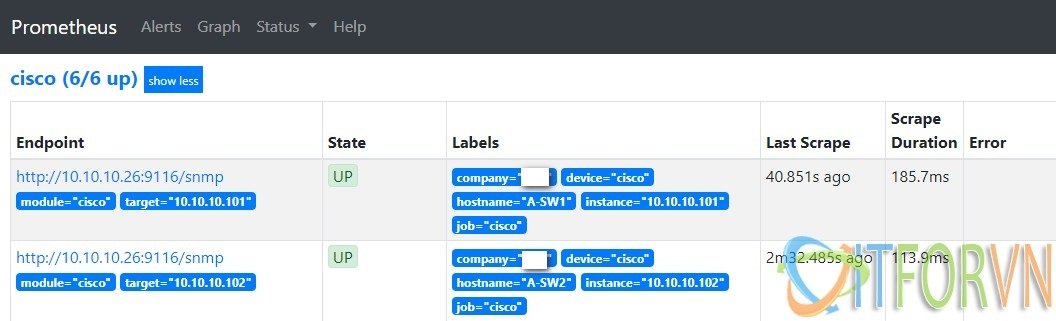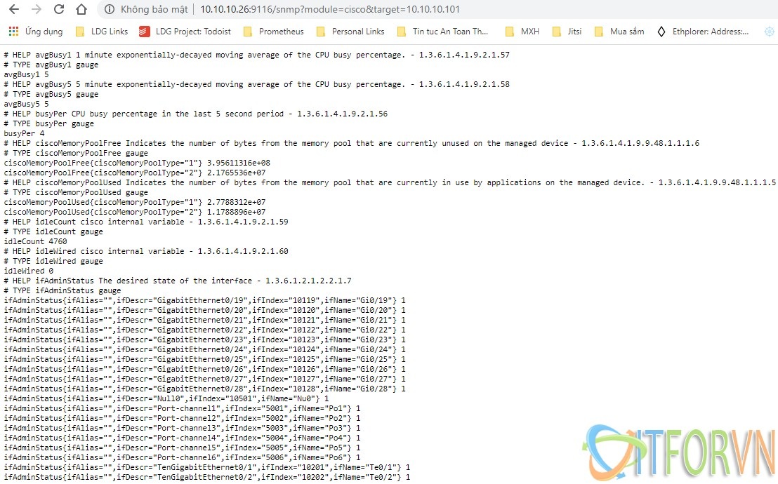 Nguồn tham khảo: https://github.com/prometheus/snmp_exporter https://grafana.com/grafana/dashboards/7567 Bài viết chỉ mang tính chất tham khảo và chia sẻ, các trong quá trình làm chắc chắn sẽ có bạn gặp bug. Nếu gặp bug thì vào telegram group ITFORVN để nhờ support từ cộng đồng. Hoặc các bạn thể có truy cập vào nguồn tham khảo để làm theo hướng dẫn chính thống. Ngoài ra bạn có thể tham gia Forum Google [prometheus-users] của nước ngoài để hỏi đáp.