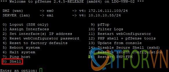 Bước 01: SSH vào pFsense, chọn 8 để vào shell