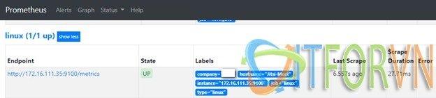 Bước 06: Tạo job trong prometheus để giám sát server Linux này với nội dung job sau: