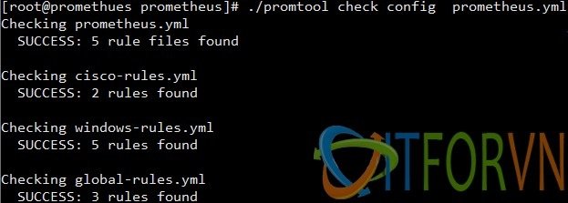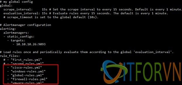 Bước 06: Tiếp tục chúng ta sẽ khai báo tên của rule đó vào cấu hình của prometheus theo như hình bên dưới.