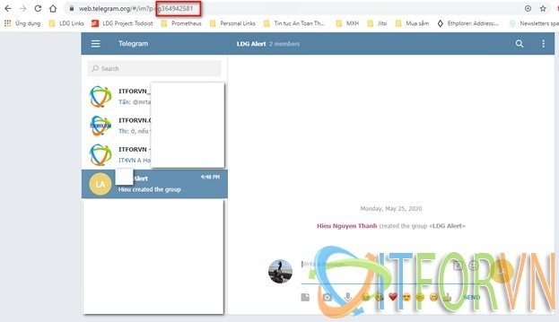 Tiếp tục tạo group sau đó add bot vừa tạo vào, sử dụng telegram qua web bạn sẽ lấy dc tham số -chat-id