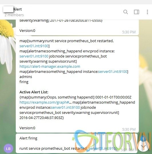 Thân chào các anh em ITFORVN. Đây là bài cuối cùng trong seri chia sẻ về Promehtues và Grafana. Hôm nay mình chia sẻ đến các bạn cách giám cấu hình Alert trong Prometheus và sử dụng telegram để làm công cụ gửi tin nhắn cảnh báo. Mình cảm thấy alert qua email hơi phiền vì phải nhận nhiều mail spam và thấy rằng vì telegram hiện tại rất thông dụng với mọi người và hầu như ai cũng có sử dụng telegram. Chính vì thế mình muốn hướng dẫn các bạn nhận các alert của hệ thống qua telegram cho tiện. Cuối bài là link download các rule mà mình đã edit. Anh em nào cần thì cứ download về sử dụng nhé.