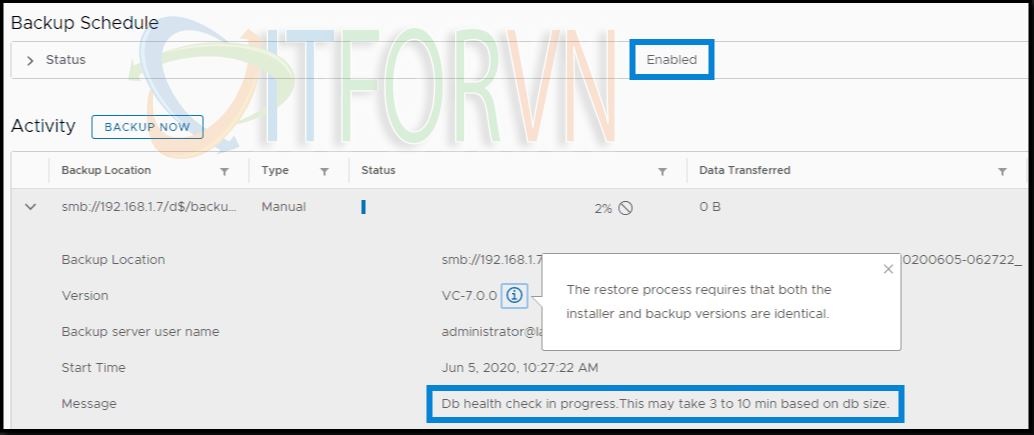 Ngoài ra, nếu bạn muốn restore toàn bộ vCSA, bạn phải sử dụng cùng một installer ISO, bởi vì các phiên bản trình cài đặt (installer) và sao lưu (backup) phải khớp nhau.