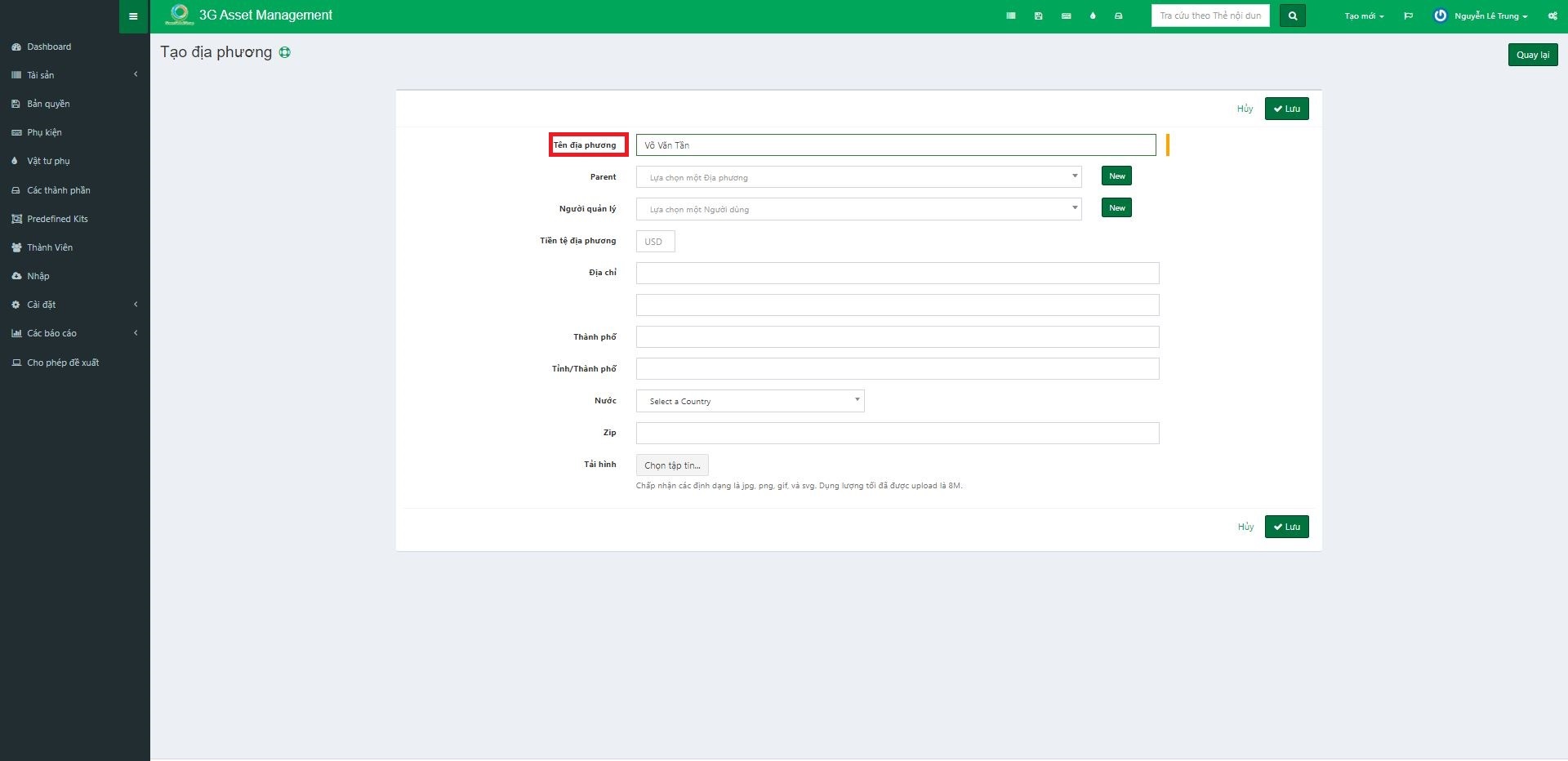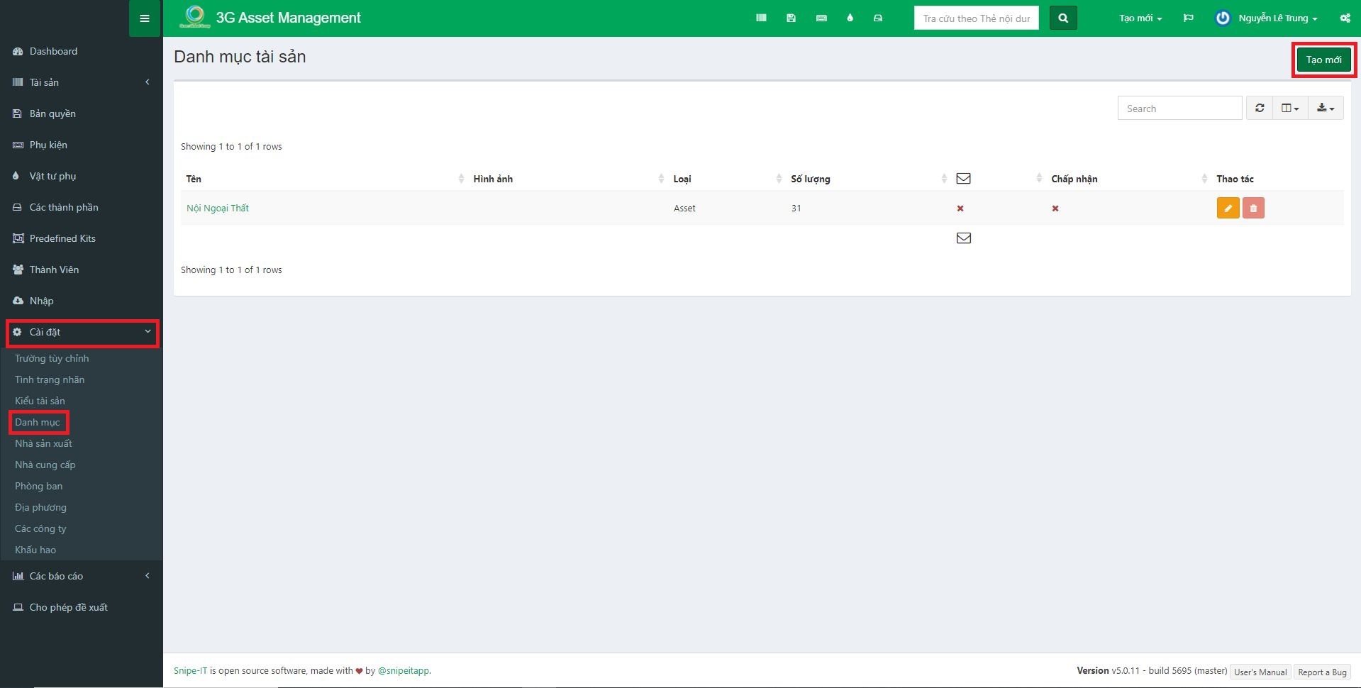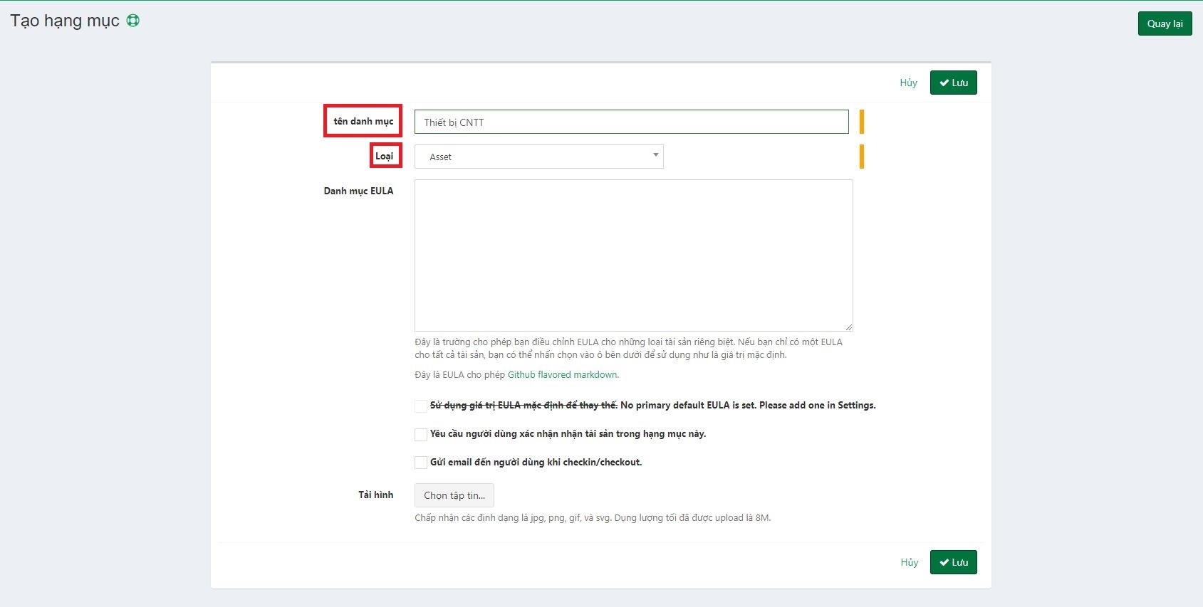 Nhập tên danh mục (Thiết bị CNTT) -> loại (ở đây có nhiều loại tùy theo mà các bạn chọn, ở đây mình chọn nó là asset) -> Lưu (phần này không cần có hình cũng được)