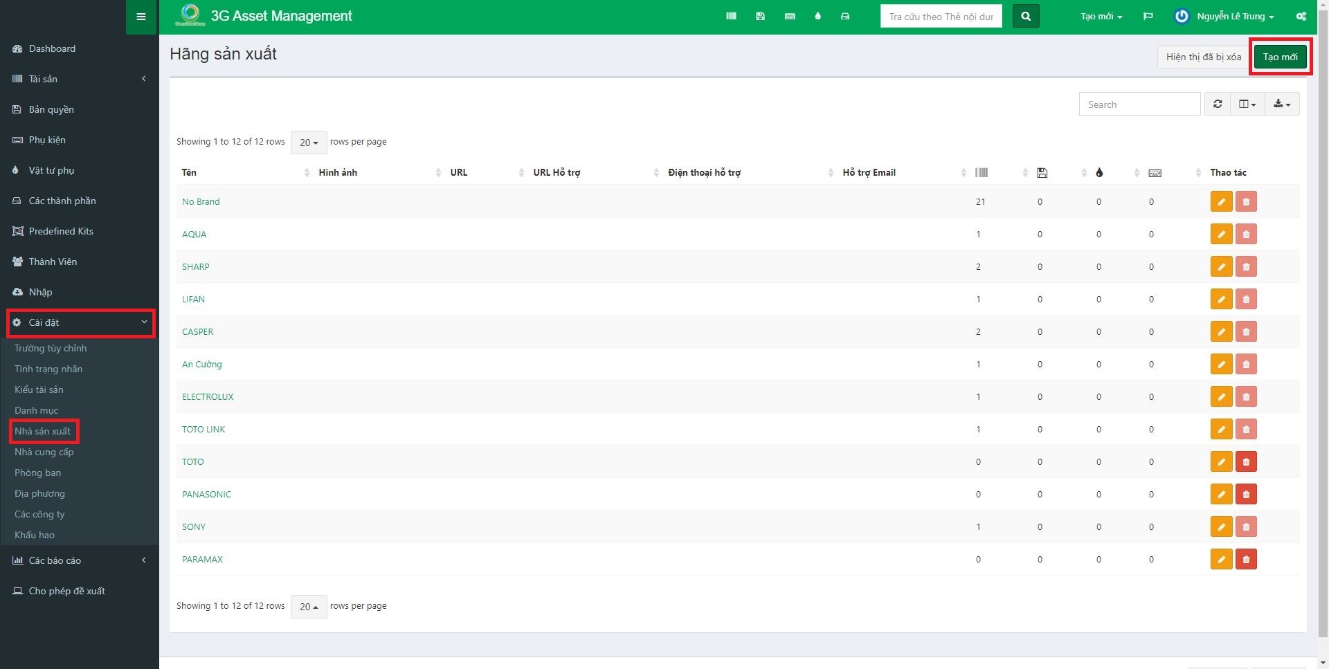 Cài đặt -> Nhà sản xuất -> Tạo mới