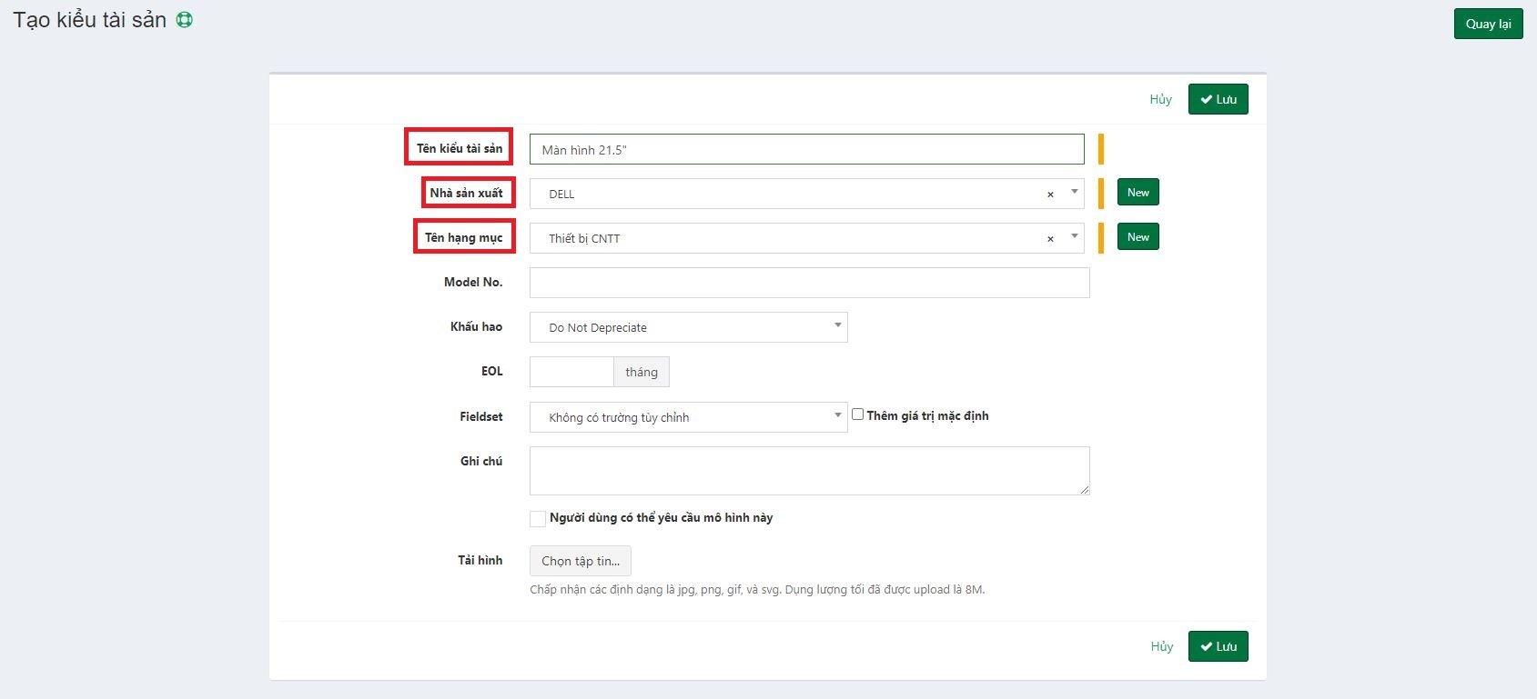 Điền tên kiểu tài sản (Màn hình 21.5) -> chọn nhà sản xuất (DELL – đã tạo phía trên) -> Chọn tên hạng mục (Thiết bị CNTT – đã tạo ở phần danh mục) -> Lưu