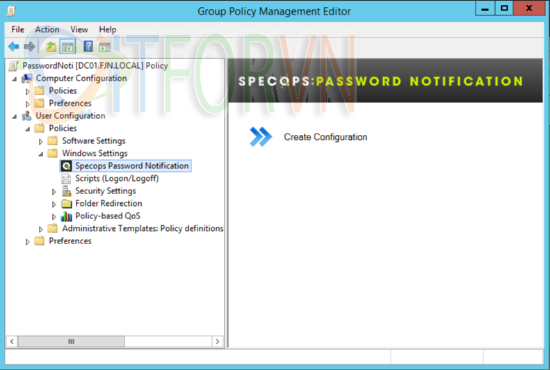 Bạn sẽ thấy một mục mới trong phần User Configuration > Policies > Windows Settings> Specops Password Notifications. Khi bạn bấm vào nút này, bạn sẽ thấy tùy chọn Create Configuration như bên dưới.