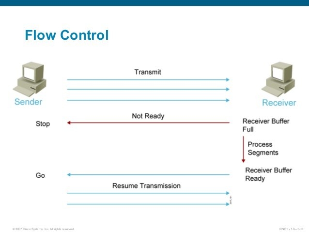 Nếu host A gửi dữ liệu quá nhanh, host B không xử lí kịp, dữ liệu sẻ dễ bị mất. Để tránh mất dữ liệu host nhận trong phương thức TCP sẻ bật cơ chế điều khiển luồng bằng cách gửi cho host A một thông báo cho biết rằng host B đang không xử lí kịp chưa sẳn sàng tiếp nhận segment mới. Khi nhận được thông báo này host A sẻ dừng gửi segment. Đợi host B xử lí, khi host B xử lí hoàn tất. Host B sẻ gửi một thông báo nó đã sẳn sàng tiếp nhận dữ liệu, host A sẻ tiếp tục gửi segment.