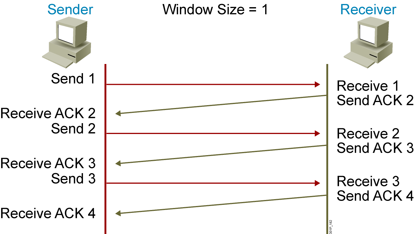 Host A gửi một segment với Window size = 1 sẻ respond lại một ACK 2 từ host B gửi lại yêu cầu gửi tiếp gói ACK 2 và tiến trình tiếp tục diễn ra mỗi lần 1 gói ACK.