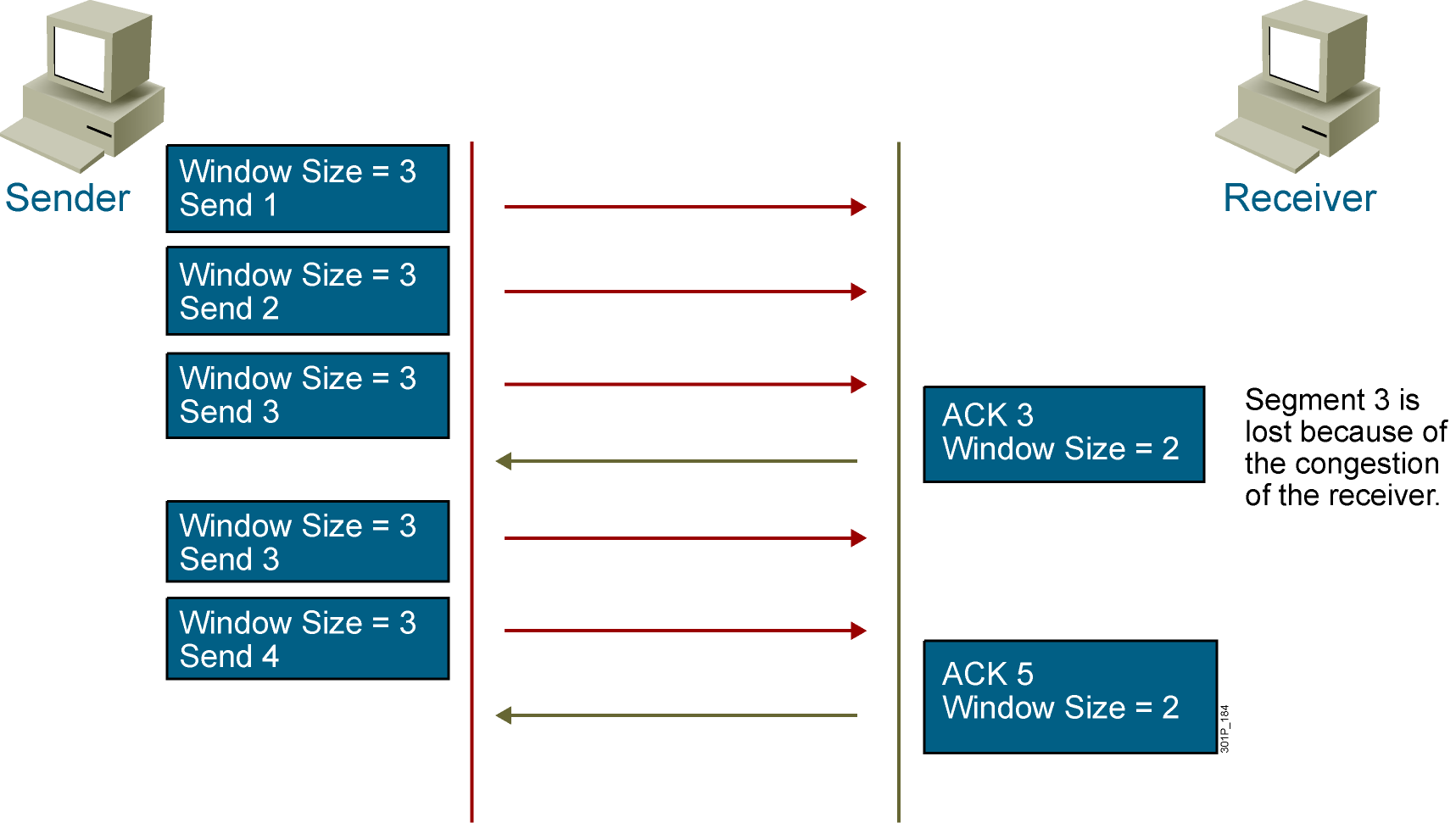 -Giả sử host A gửi segment với Window size = 3, trên đường truyền bị mất gói. Host B chỉ nhận được 2 segment, host B sẻ gửi thông báo cho host A yêu cầu gửi lại với Window size = 2.