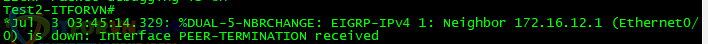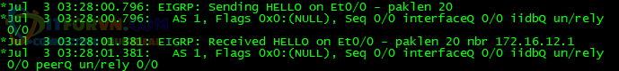 Log ta debug được khi clear ip eigrp neighbors*Jul 3 03:45:16.954: %DUAL-5-NBRCHANGE: EIGRP-IPv4 1: Neighbor 172.16.12.1 (Ethernet0/0) is up: new adjacencyQuan hệ neighbor đã thiết lập lại