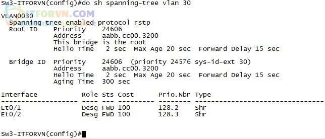 Sw3-ITFORVN(config)#spanning-tree vlan 30 root primary