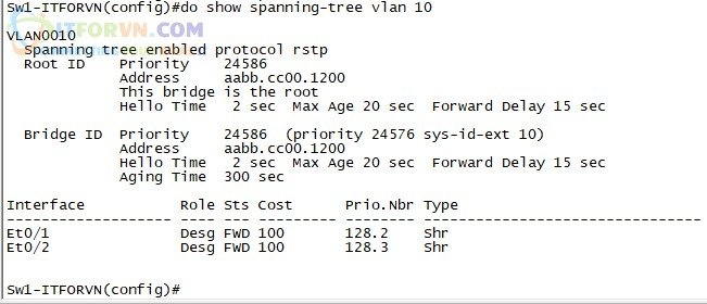 Sw1-ITFORVN(config)#spanning-tree vlan 10 root primary