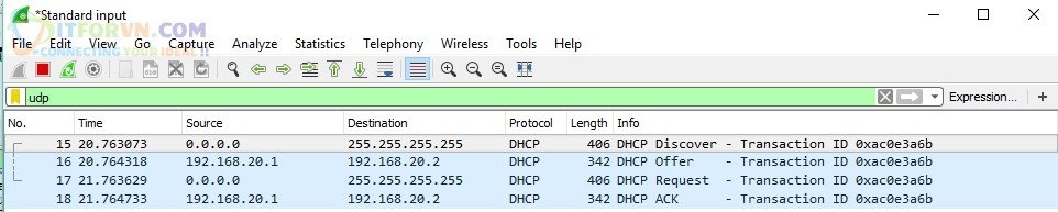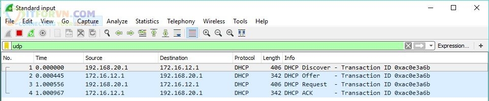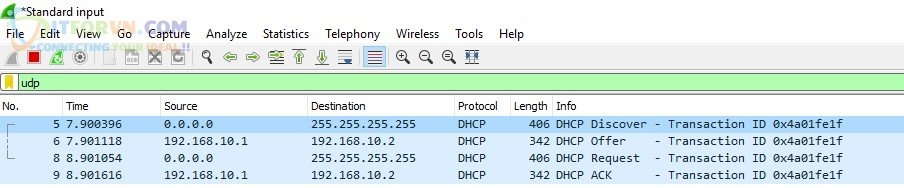 Ta tiến hành dùng Wireshark bắt các gói tin của DHCP