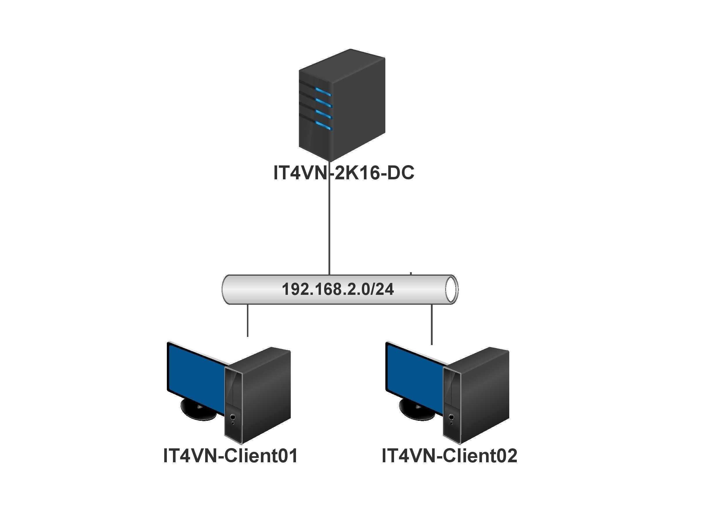 Như các bạn đã biết, thì từ Windows Server 2012 trở về sau thì lệnh dcpromo đã bị vô hiệu hóa, do vậy nếu muốn tạo DC thì phải cần đến ADDS (Active Directory Domain Services) từ giao diện quản lý - Server Manager. Để thực hiện bài lab này chúng ta cần 1 con server 2016 chạy ở dạng Workgroup (chạy độc lập không chịu sử quản lý trong miền ) và 1 con Client chạy win 10 join domain để chịu sử quản lý trong miền . Ta có sơ đồ như sau :