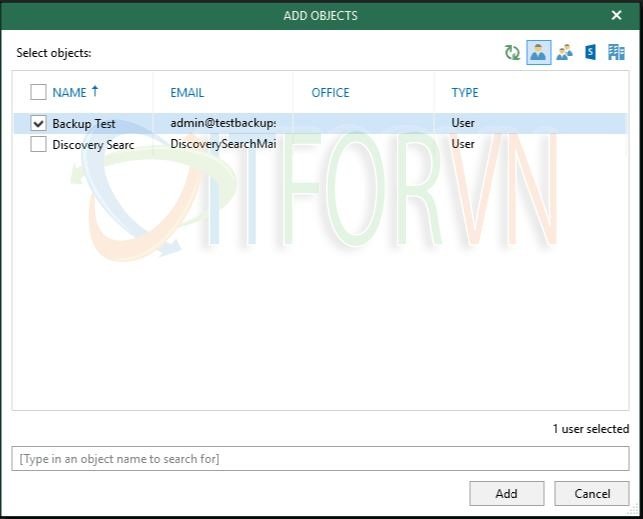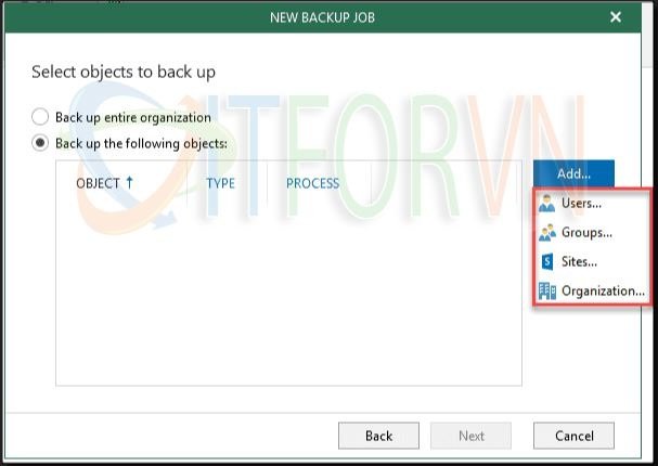 Tiếp theo, bạn có thể chọn Back up entire organization hoặc Back up the following objects. Nếu bạn chọn chọn các đối tượng cụ thể, click Add để chọn users and services.