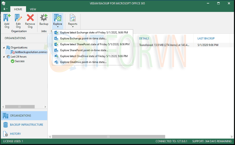 Để restore, bạn cần đảm bảo rằng bạn đã cài đặt Exchange Online Explorer và SharePoint Explorer để đọc các bản sao lưu được tạo từ Office 365. Sau đó, bạn chọn explorer để show và chọn backup and recover các mục cần thiết.