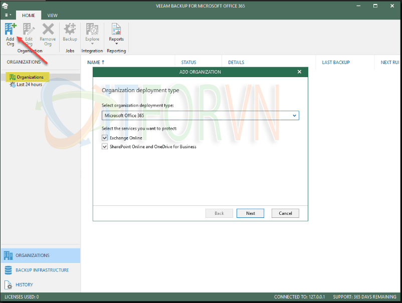 Sau khi cài đặt Veeam Backup for Office 365, bạn sẽ add an organization. Đây là quá trình kết nối Veeam với môi trường Office 365 của bạn.