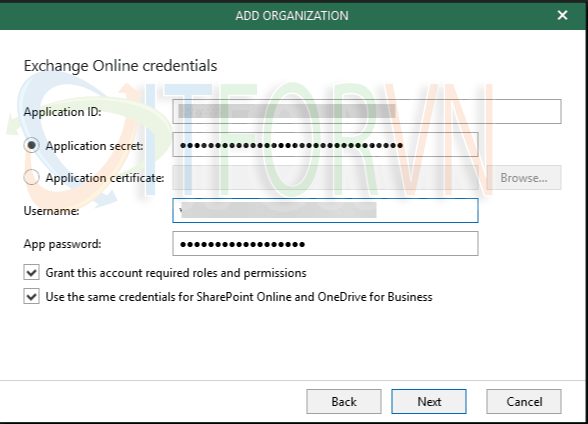 Trong Add organization, bạn cần phải add Application ID, Application secret, username, và app password. Veeam có knowledge base (KB) về cách thu thập và định cấu hình ứng dụng môi trường Azure Active Directory (AD) để kết nối Veeam với Office 365.