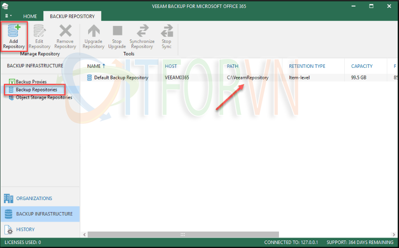 Nếu bạn đã sử dụng Veeam Backup & Replication, cấu hình Office 365 backup sẽ rất quen thuộc. Trong cấu hình Backup Infrastructure, bạn có thể thêm nơi lưu trữ và xem thông tin về bộ nhớ được định cấu hình cho môi trường Office 365. Theo mặc định, Veeam sẽ tạo một kho lưu trữ mặc định trong C:\VeeamRepository.