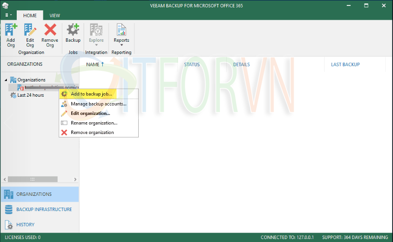 Adding an Office 365 backup job cũng đơn giản như right-clicking vào organization và chọn Add to backup job.