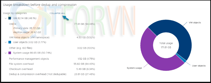 vSAN 7.0 nói chung là overview về total capacity của tất cả objects. Tổng dung lượng của vSAN được sử dụng là bao nhiêu, v.v. Ngoài ra còn có một số chi tiết về overhead files, v.v.