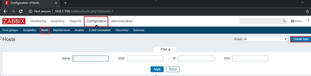 Vào mục Configuration, chọn Host, nhấn Create Host
